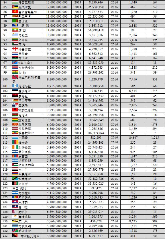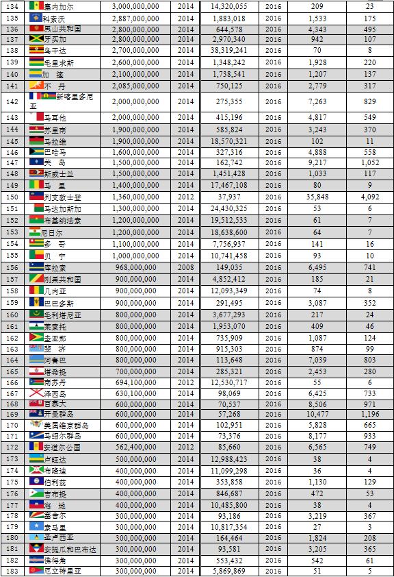 本文數(shù)據(jù)主要由美國(guó)中央情報(bào)局(CIA)統(tǒng)計(jì),但個(gè)別國(guó)家如中國(guó)、印度尼西亞、阿聯(lián)酋、菲律賓、尼泊爾、北馬里亞納群島等由該國(guó)的統(tǒng)計(jì)機(jī)構(gòu)統(tǒng)計(jì)。