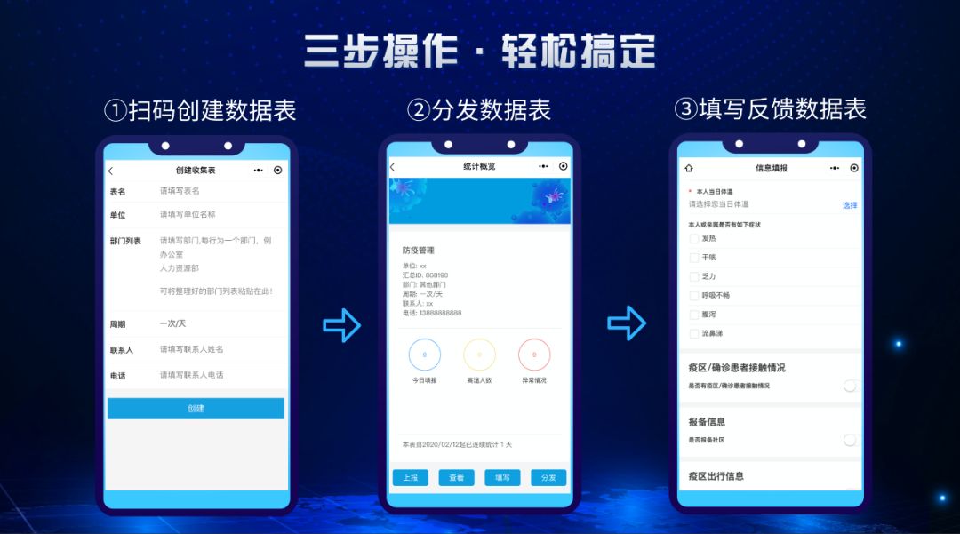 只需微信掃描二維碼進(jìn)入界面,簡單進(jìn)行三步操作即可搞定每日繁瑣的數(shù)據(jù)收集工作,并在系統(tǒng)后臺進(jìn)行統(tǒng)計(jì)和數(shù)據(jù)匯總。使用說明書?不存在的!一秒上手,簡直So easy!