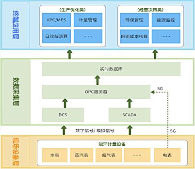 該體系主要由現(xiàn)場(chǎng)設(shè)備層、數(shù)據(jù)采集層、終端應(yīng)用層等組成。他們根據(jù)工藝與計(jì)量要求,先后配備了帶信號(hào)遠(yuǎn)傳功能、高準(zhǔn)確度等級(jí)的質(zhì)量流量計(jì)、電磁流量計(jì)、超聲波流量計(jì)等智能型計(jì)量?jī)x表,實(shí)現(xiàn)一、二級(jí)能源計(jì)量表配備率達(dá)100%。通過(guò)計(jì)量?jī)x表傳輸端采集能源計(jì)量數(shù)據(jù),上傳至DCS或SCADA系統(tǒng),再通過(guò)OPC接口上傳至實(shí)時(shí)數(shù)據(jù)庫(kù),采用5G無(wú)線傳輸技術(shù)解決偏遠(yuǎn)區(qū)域計(jì)量?jī)x表信號(hào)的數(shù)據(jù)采集與傳輸,最終為終端系統(tǒng)提供有效數(shù)據(jù)支持。