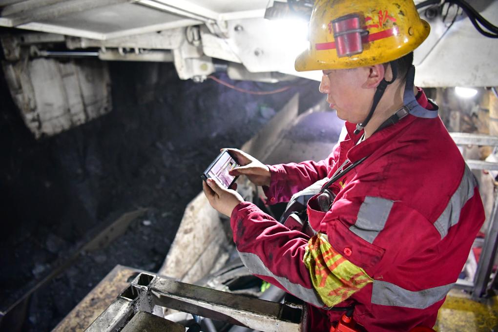 在曹家灘智慧礦山智能化工作面內(nèi),綜采二隊(duì)機(jī)電副隊(duì)長蔡進(jìn)通過操作手機(jī)控制生產(chǎn)設(shè)備(2021年10月12日攝)。新華社記者 邵瑞 攝