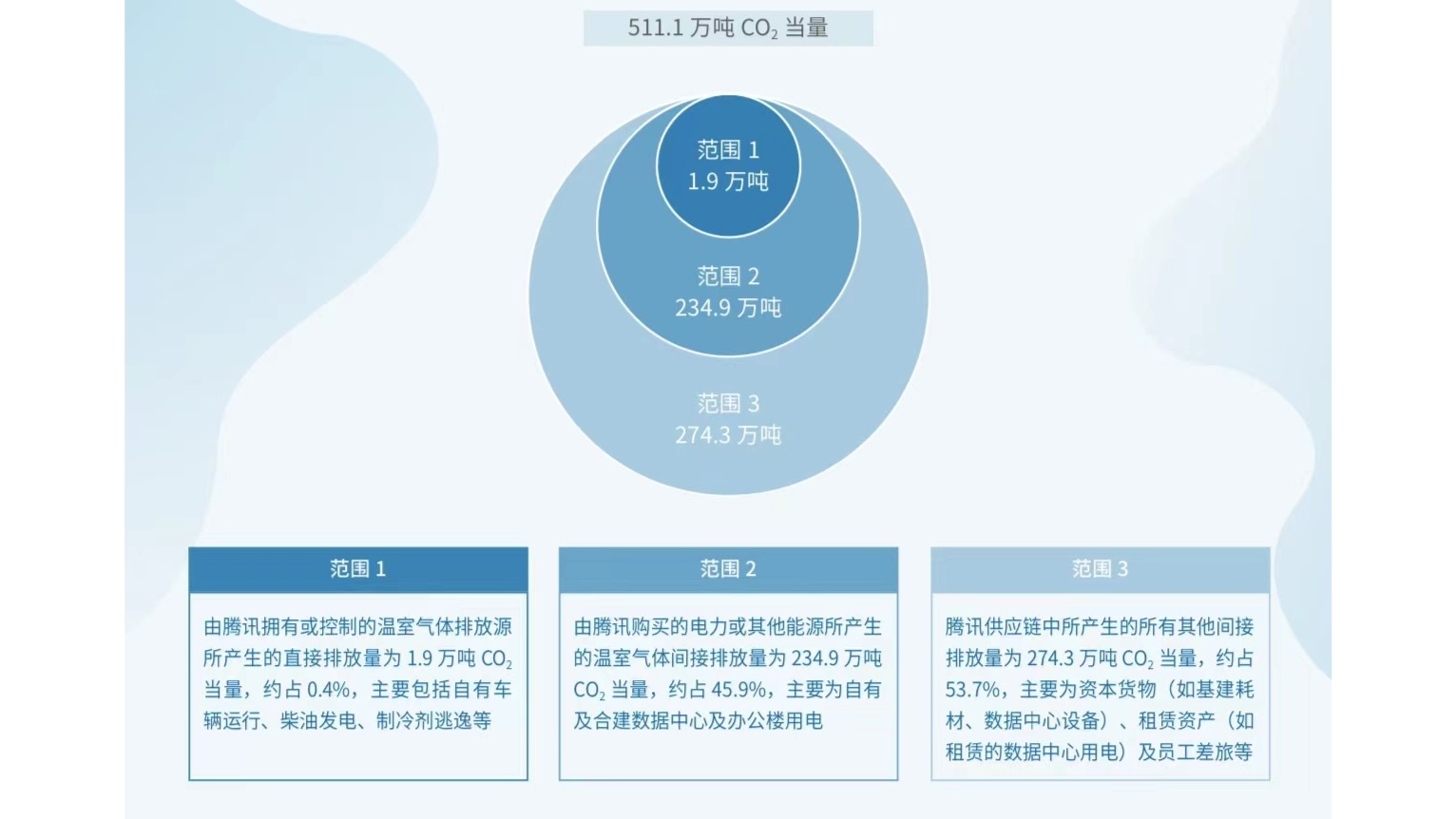 2021年,騰訊溫室氣體排放量總計(jì)511.1萬噸。其中,公司擁有或控制的溫室氣體排放源所產(chǎn)生的直接排放量(即“范圍1”)、購(gòu)買的電力或其他能源所產(chǎn)生的間接排放量(即“范圍2”)分別為1.9萬噸和234.9萬噸;供應(yīng)鏈上下游產(chǎn)生的其他間接排放量(即“范圍3”)為274.3萬噸。該結(jié)果是騰訊基于國(guó)際通行的碳減排范圍標(biāo)準(zhǔn)進(jìn)行的系統(tǒng)全面的碳盤查。