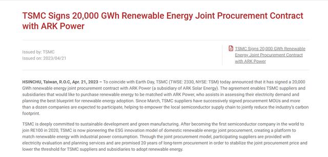 通過聯(lián)合采購的模式,提供參與的供應商用電評估與規(guī)劃服務,并以為期 20 年的長期采購量為承諾, 降低臺積電供應商與子公司采用再生能源的門檻。誠新綠能預計在 3 年內提供總裝置達 2GW 的電力,臺積電承諾于 2050 年達凈零排放目標。
