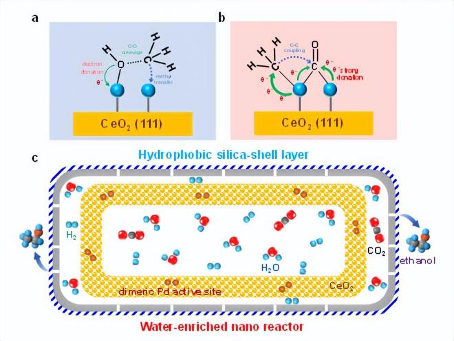 其中的水環(huán)境可以穩(wěn)定雙靶活性位點(diǎn),里邊的催化劑能夠在240℃、3MPa時(shí)將二氧化碳近100%選擇性高效穩(wěn)定地轉(zhuǎn)化為乙醇。