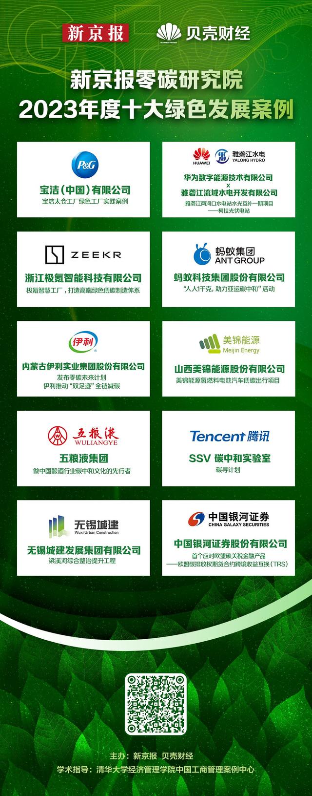 12月12日,在新京報零碳研究院2023綠色發(fā)展峰會上,由新京報零碳研究院和清華大學(xué)經(jīng)管學(xué)院中國工商管理案例中心共同評選出的“2023年度綠色發(fā)展十大案例”正式公布。入圍案例涵蓋新能源大規(guī)模開發(fā)利用、城市生態(tài)治理、綠色制造、低碳技術(shù)、碳足跡、碳金融和碳普惠等重點(diǎn)領(lǐng)域,基本代表了2023年度綠色發(fā)展的主要方向。其中,中國銀河、無錫城建、螞蟻集團(tuán)、伊利、騰訊、寶潔中國、五糧液、極氪、山西美錦能源、華為數(shù)字能源等項(xiàng)目入圍。加強(qiáng)“雙碳”相關(guān)項(xiàng)目和技術(shù)試點(diǎn)示范對推動和引領(lǐng)經(jīng)濟(jì)社會各領(lǐng)域綠色低碳轉(zhuǎn)型至關(guān)重要。