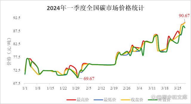 隨著時間進入2024年,碳價開始上漲,直至2024年3月28日,全國碳市場碳配額的收盤價終于沖破了90元/噸大關,3月29日更是達到了歷史最高價:90.67元/噸。較2月的最后一個交易日增長11.05%。照此增長趨勢,碳價沖破百元大關,指日可待!