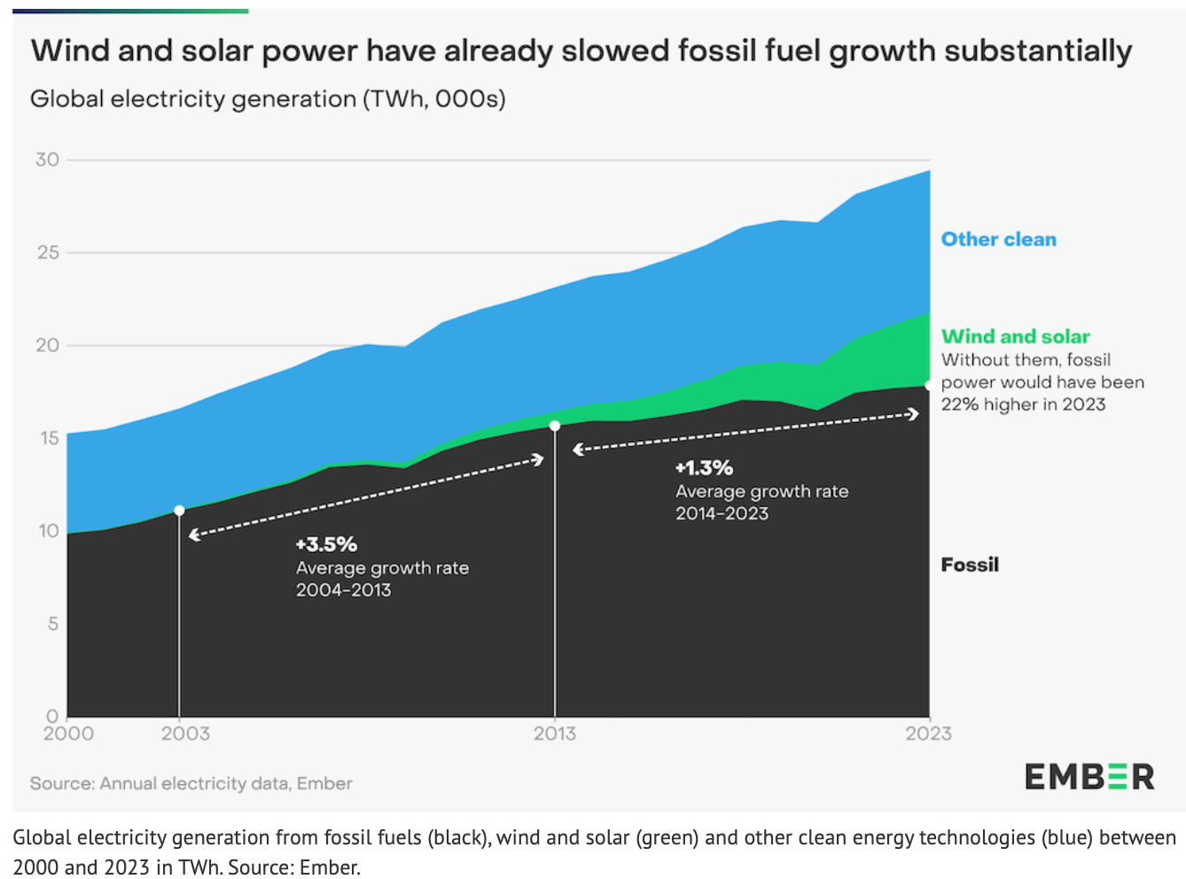 在全球范圍內(nèi),風(fēng)能和太陽能現(xiàn)在的增長速度已經(jīng)足以超過不斷增長的電力需求,這意味著從2024年起,全球化石燃料發(fā)電量和排放量將達(dá)到峰值。因此,化石燃料發(fā)電量下降的新時(shí)代即將到來。2023年可再生能源滿足了創(chuàng)紀(jì)錄的30%的全球電力需求,如果不是這一年水力發(fā)電的創(chuàng)紀(jì)錄下降,2023年排放量可能已經(jīng)達(dá)到峰值。風(fēng)能和太陽能的崛起阻礙了化石燃料發(fā)電的增長,如果沒有風(fēng)能和太陽能,2023年化石燃料發(fā)電將增長22%,本會使全球年排放量增加約40億噸二氧化碳。