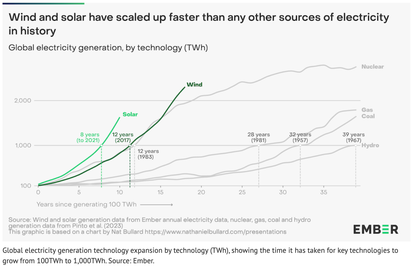 根據(jù)智庫Ember的最新報(bào)告分析,在全球范圍內(nèi)風(fēng)能和太陽能的增長速度比歷史上任何其他電力來源都快。太陽能和風(fēng)能從每年100太瓦時(shí)增長到1000太瓦時(shí),分別只花了8年和12年的時(shí)間。同樣是100太瓦時(shí)到1000太瓦時(shí),天然氣電廠花了28年、煤電化了32年、水電花了39年。