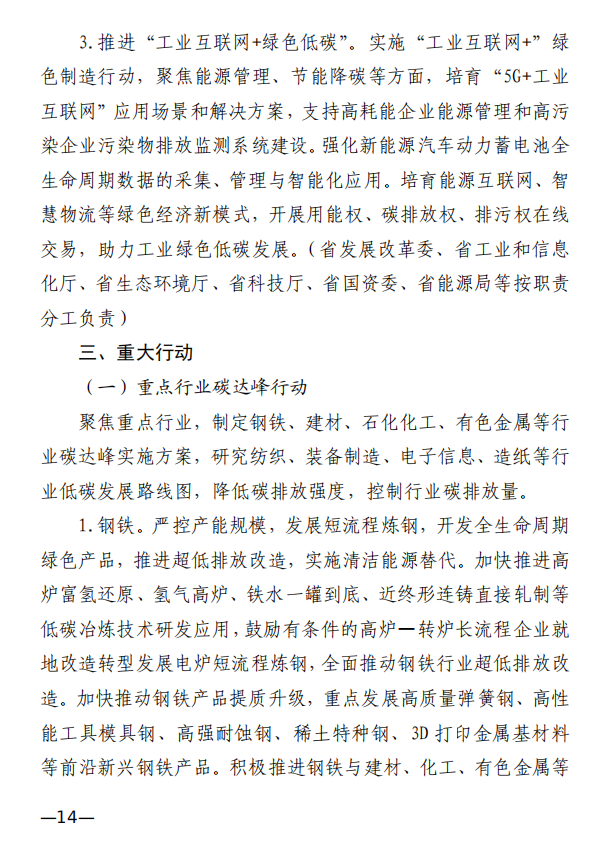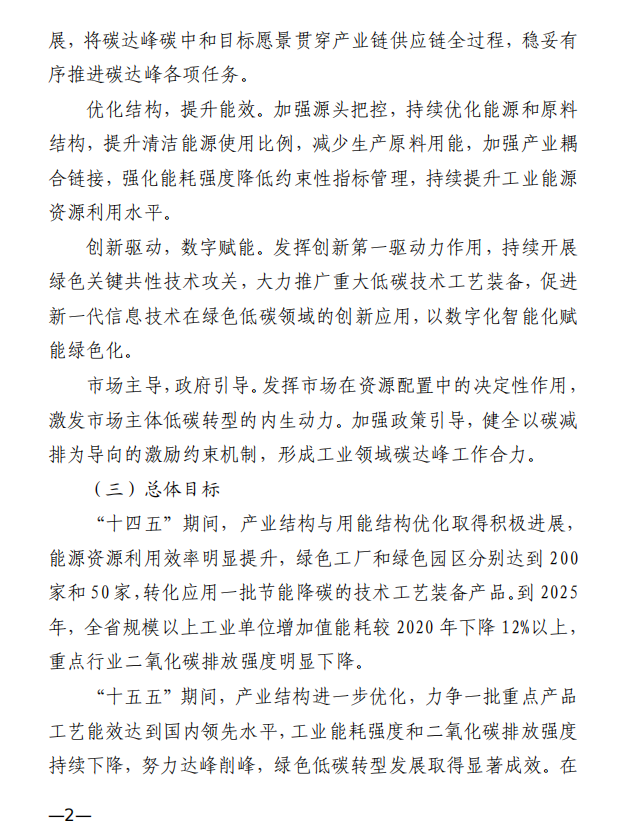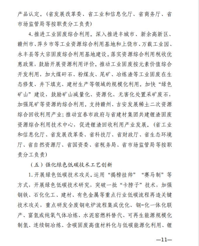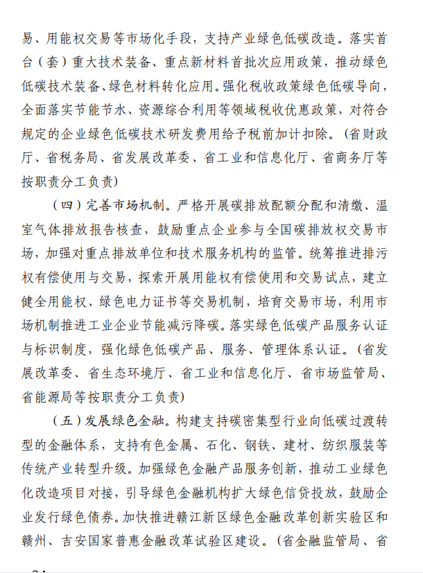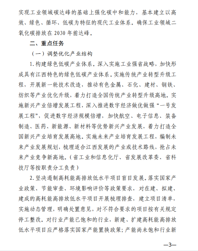 10月10日,江西省工業(yè)和信息化廳、江西省發(fā)展和改革委員會和江西省生態(tài)環(huán)境廳發(fā)布《關(guān)于印發(fā)江西省工業(yè)領(lǐng)域碳達峰實施方案的通知》,《江西省工業(yè)領(lǐng)域碳達峰實施方案》提出,“十四五”期間,江西力爭產(chǎn)業(yè)結(jié)構(gòu)與用能結(jié)構(gòu)優(yōu)化取得積極進展,能源資源利用效率明顯提升,綠色工廠和綠色園區(qū)分別達到200家和50家;到2025年,全省規(guī)模以上工業(yè)單位增加值能耗較2020年下降12%以上?!笆逦濉逼陂g,力爭一批重點產(chǎn)品工藝能效達到國內(nèi)領(lǐng)先水平,基本建立以高效、綠色、循環(huán)、低碳為特征的現(xiàn)代工業(yè)體系;確保工業(yè)領(lǐng)域二氧化碳排放在2030年前達峰。