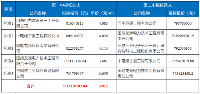 “寧湘直流”配套新能源基地中衛(wèi)3GW一期1GW,5個標(biāo)段的開標(biāo)結(jié)果如下表所示。