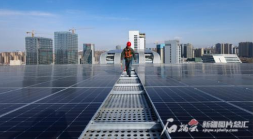 3月16日,工作人員在屋頂巡檢光伏發(fā)電設備