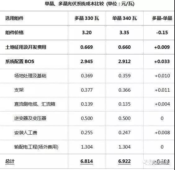 其中假設多晶組件價格為3.20元/瓦,單晶組件價格為3.35元/瓦。根據(jù)計算可知,多晶系統(tǒng)每瓦可以少花0.108元人民幣。