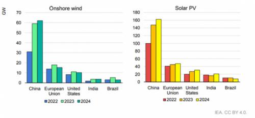 光伏組件價(jià)格的下降、分布式光伏系統(tǒng)的更多采用以及大規(guī)模部署的政策推動(dòng),推動(dòng)了包括中國(guó)、歐盟、美國(guó)和印度在內(nèi)的所有主要光伏市場(chǎng)的增長(zhǎng)。相比之下,如果不迅速實(shí)施激勵(lì)政策,預(yù)計(jì)2024年全球陸上風(fēng)力發(fā)電新增裝機(jī)容量將比2023年下降約5%。