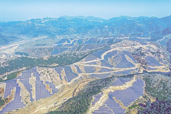 發(fā)電站背后十幾個(gè)山頭的向陽(yáng)坡上,分散著占地700多畝的太陽(yáng)能光伏發(fā)電場(chǎng),在陽(yáng)光下熠熠生輝。光伏板每塊約0.75平方米,總計(jì)有160萬塊,總裝機(jī)容量50兆瓦。在光照條件好的情況下,光伏板每天可發(fā)電近20萬千瓦時(shí)。