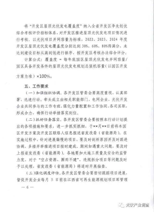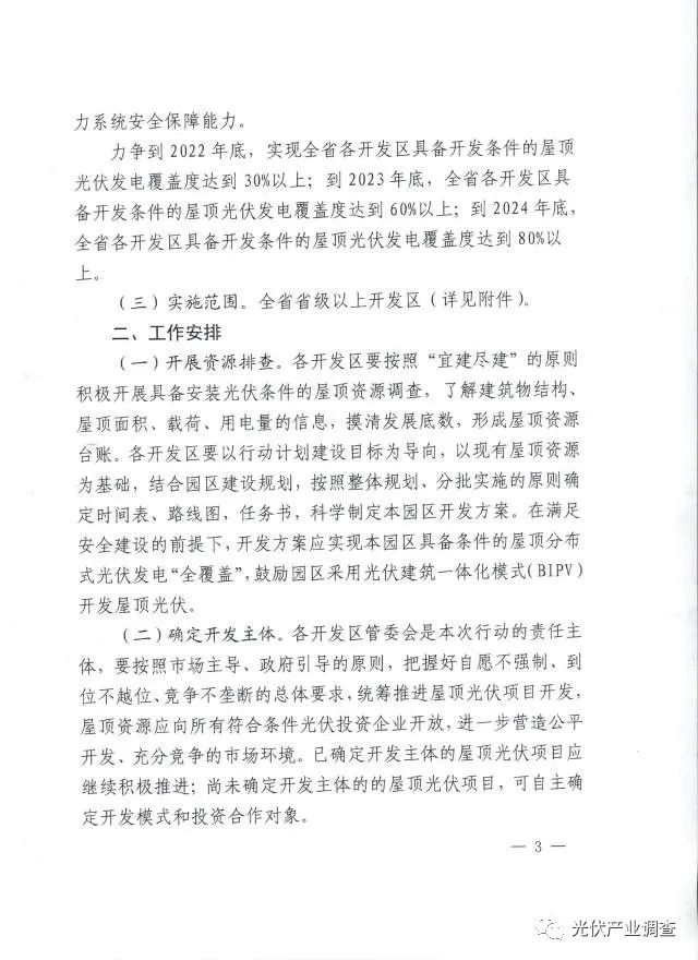 力爭到2022年底,實現(xiàn)全省各開發(fā)區(qū)具備開發(fā)條件的屋頂光伏發(fā)電覆蓋度達到30%以上;到2023年底,全省各開發(fā)區(qū)具備開發(fā)條件的屋頂光伏發(fā)電覆蓋度達到60%以上;到2024年底,全省各開發(fā)區(qū)具備開發(fā)條件的屋頂光伏發(fā)電覆蓋度達到80%以上。