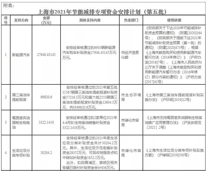 1、按照《財政部關于下達2020年節(jié)能減排補助資金預算的通知》(財建[2020]164號)、《財政部關于提前下達2021年節(jié)能減排補助資金預算(第一批)的通知》(財建[2020]473號),根據(jù)《上海市鼓勵購買和使用新能源汽車暫行辦法(2016年修訂)》(滬府辦發(fā)[2016]7號)、《上海市人民政府辦公廳關于調(diào)整〈上海市鼓勵購買和使用新能源汽車暫行辦法(2016年修訂)部分內(nèi)容的通知〉》(滬府辦發(fā)[2017]41號)等規(guī)定,安排經(jīng)審核通過的6903輛新能源汽車購車補貼資金27948.43145萬元。