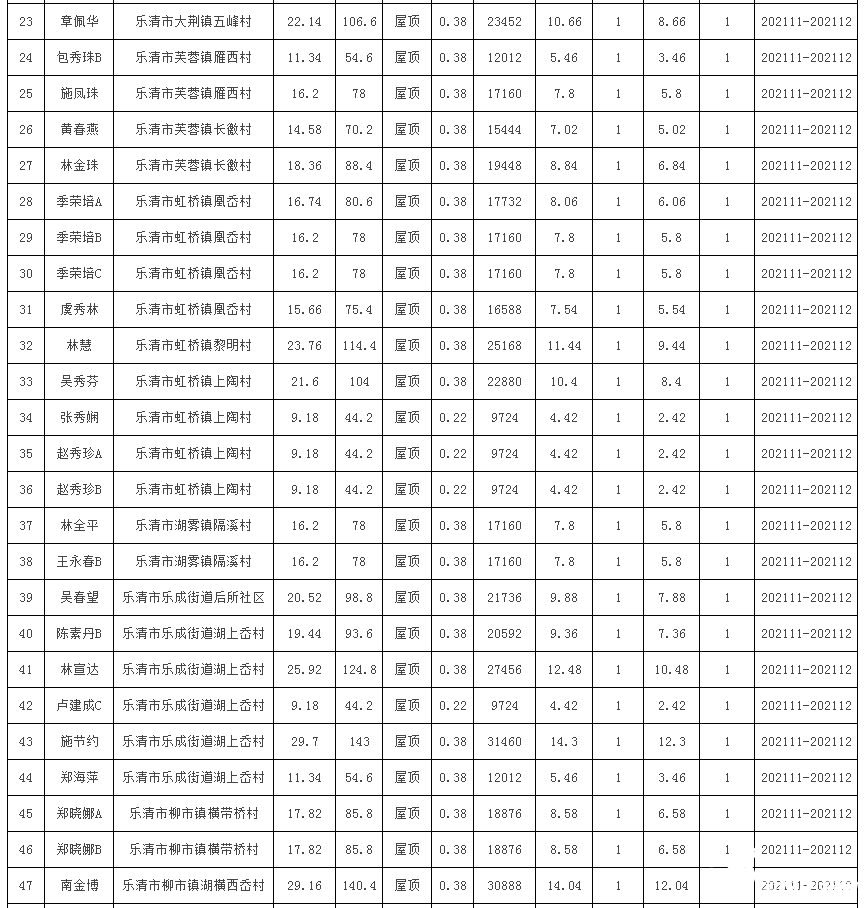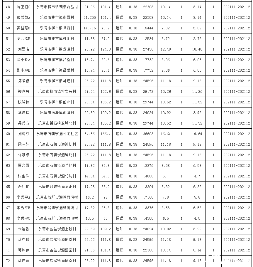 樂(lè)清市2021年第二十三批居民家庭屋頂分布式光伏發(fā)電項(xiàng)目表