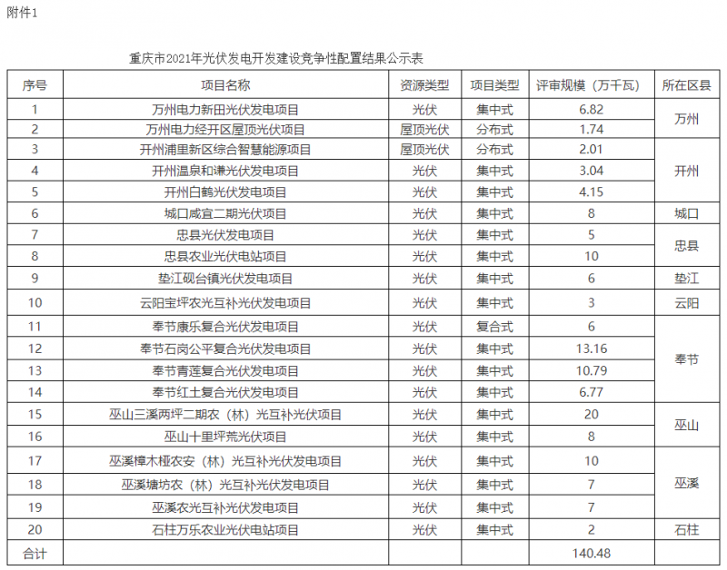 附件:1.重慶市2021年光伏發(fā)電開發(fā)建設(shè)競爭性配置結(jié)果公示表