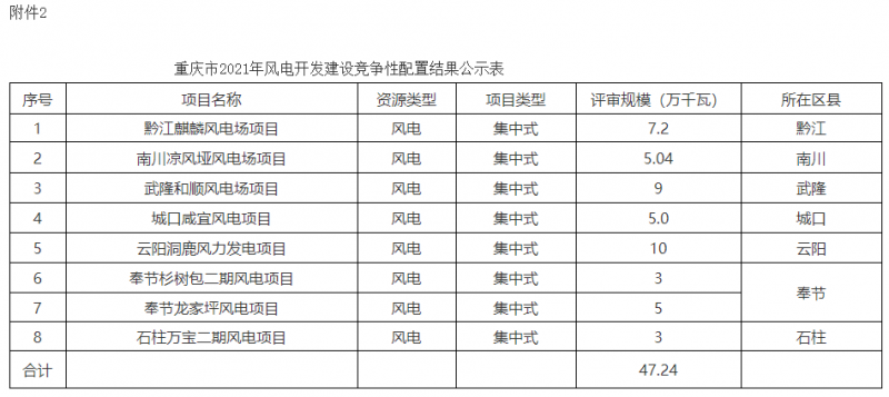 2.重慶市2021年風(fēng)電開發(fā)建設(shè)競爭性配置結(jié)果公示表