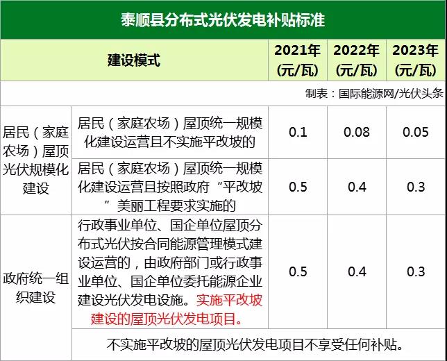 居民(家庭農(nóng)場(chǎng))屋頂統(tǒng)一規(guī)模化建設(shè)運(yùn)營(yíng)且按照政府“平改坡”美麗工程要求實(shí)施的,在光伏發(fā)電項(xiàng)目建成、并網(wǎng)和驗(yàn)收后給予居民發(fā)放一次性平改坡建設(shè)補(bǔ)貼。2021年、2022年、2023年建成、并網(wǎng)和驗(yàn)收的實(shí)行差異化補(bǔ)貼,補(bǔ)貼標(biāo)準(zhǔn)分別為0.5元/瓦、0.4元/瓦、0.3元/瓦。