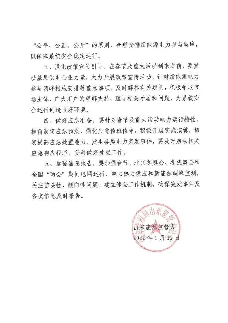1月12日,山東省能監(jiān)辦《關(guān)于做好2022年春節(jié)及重大活動期間電網(wǎng)安全穩(wěn)定運(yùn)行工作的通知》,就春節(jié)期間保障電力系統(tǒng)安全穩(wěn)定運(yùn)行和新能源發(fā)電調(diào)節(jié)能力要求方面提出意見。
