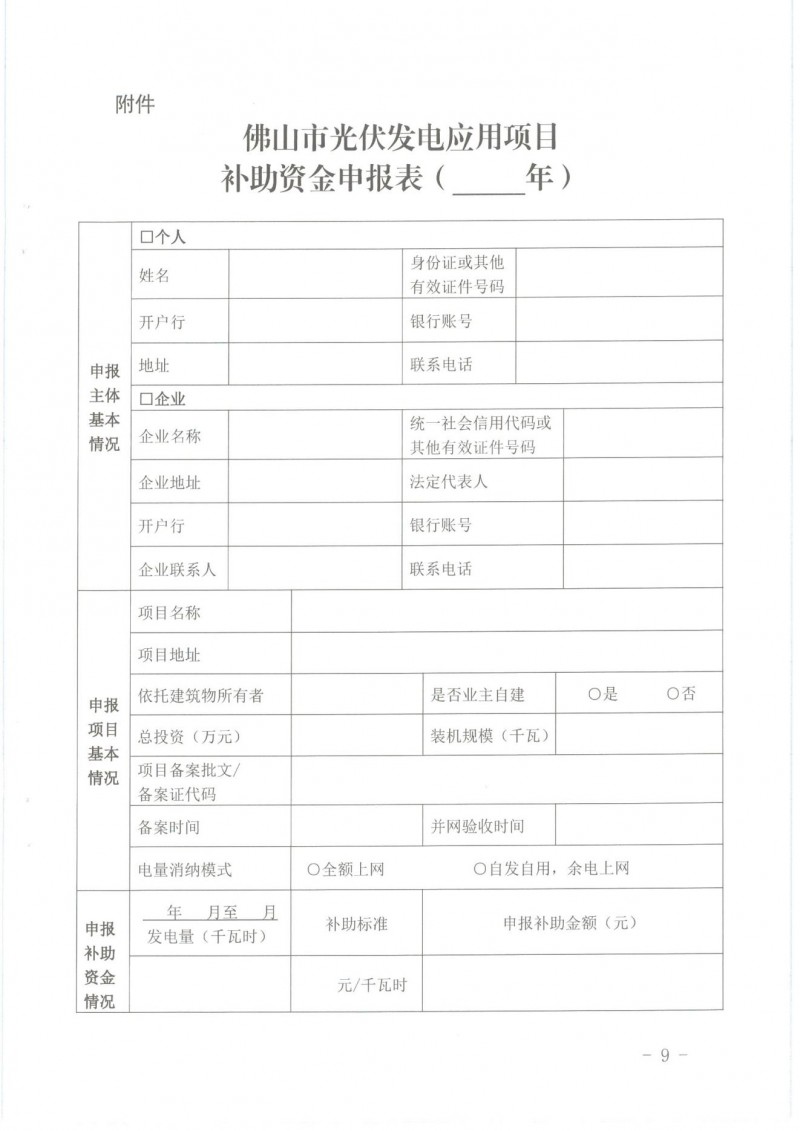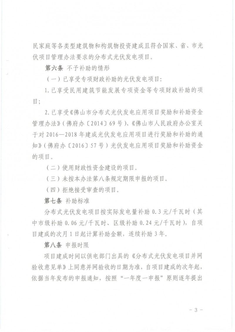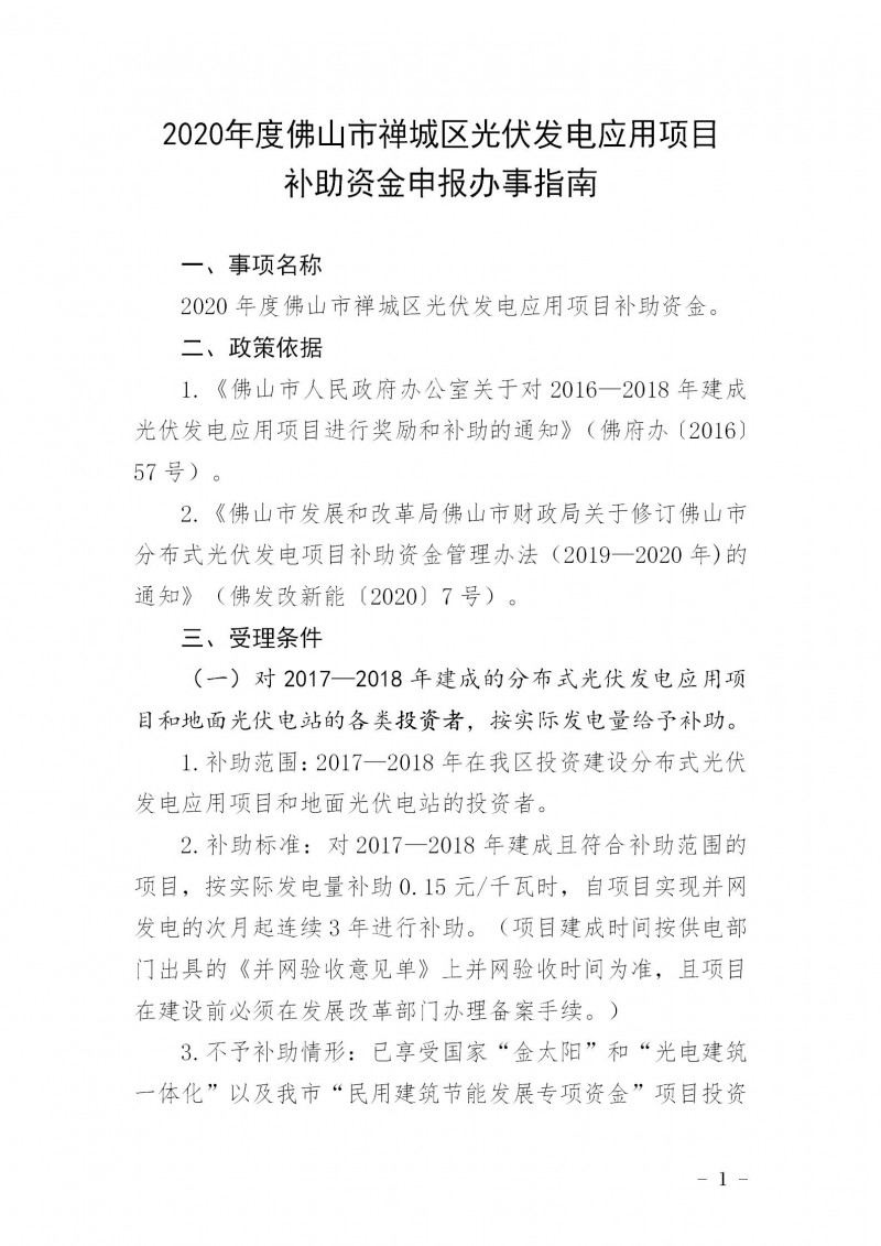根據(jù)《佛山市人民政府辦公室關(guān)于對(duì)2016—2018年建成光伏發(fā)電應(yīng)用項(xiàng)目進(jìn)行獎(jiǎng)勵(lì)和補(bǔ)助的通知》(佛府辦〔2016〕57號(hào),見附件1)、《佛山市發(fā)展和改革局佛山市財(cái)政局關(guān)于修訂佛山市分布式光伏發(fā)電項(xiàng)目補(bǔ)助資金管理辦法(2019—2020年)的通知》(佛發(fā)改新能〔2020〕7號(hào),見附件2)的文件要求,現(xiàn)開展我區(qū)2020年度光伏補(bǔ)助資金申報(bào)工作,并將有關(guān)事項(xiàng)通知如下: