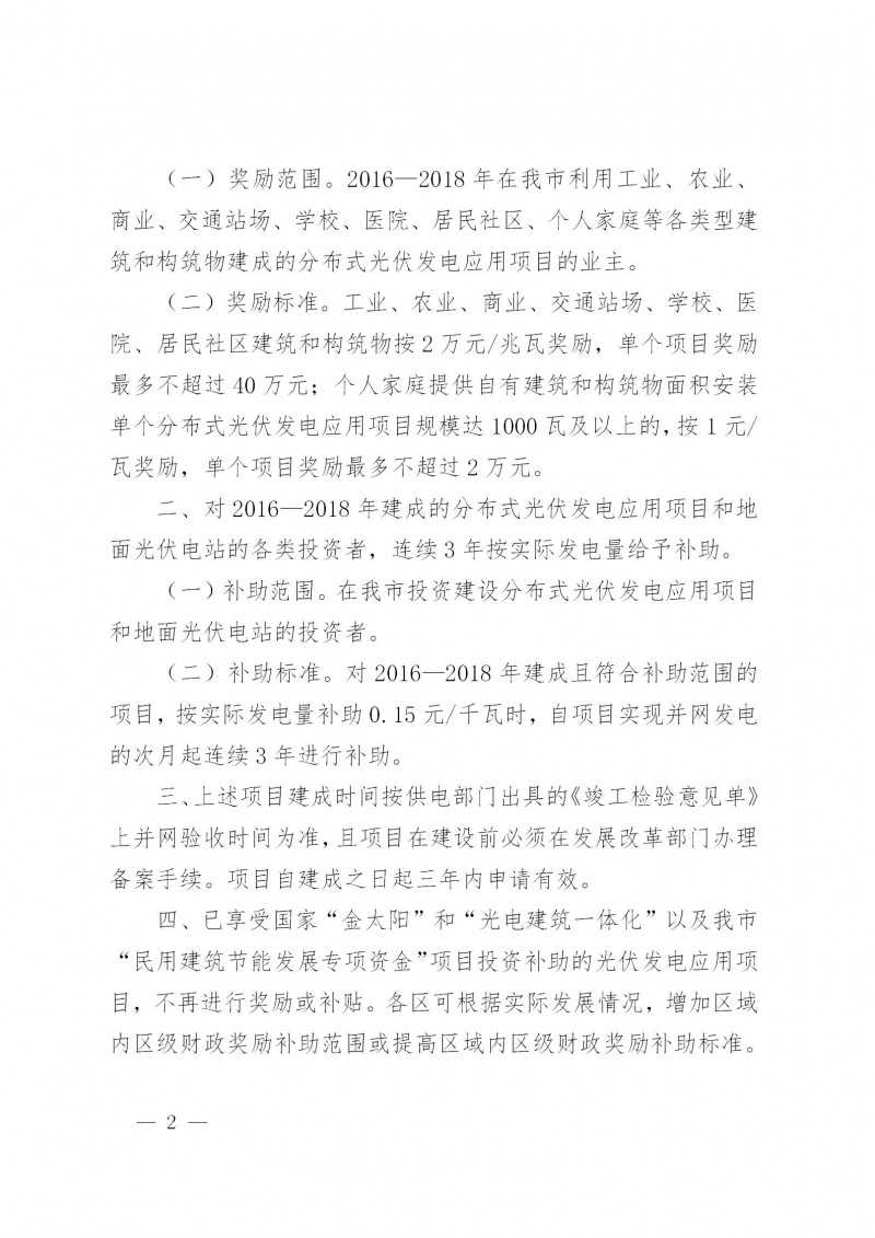 2017—2018年建成的分布式光伏發(fā)電項(xiàng)目,按實(shí)際發(fā)電量補(bǔ)助0.15元/千瓦時(shí);2019—2020年建成的分布式光伏發(fā)電項(xiàng)目,按實(shí)際發(fā)電量補(bǔ)助0.3元/千瓦時(shí)。