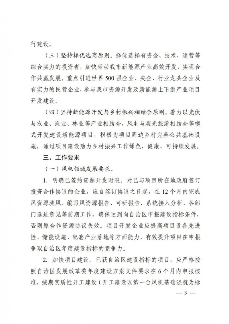 已獲自治區(qū)建設(shè)指標(biāo)的項(xiàng)目,應(yīng)嚴(yán)格按照自治區(qū)發(fā)展改革委年度建設(shè)方案文件要求在6個(gè)月內(nèi)申報(bào)核準(zhǔn),按期實(shí)質(zhì)性開工建設(shè)(開工建設(shè)以第一臺風(fēng)機(jī)基礎(chǔ)澆筑為標(biāo)志)、完工和實(shí)現(xiàn)并網(wǎng)發(fā)電,否則取消項(xiàng)目建設(shè)權(quán)限。