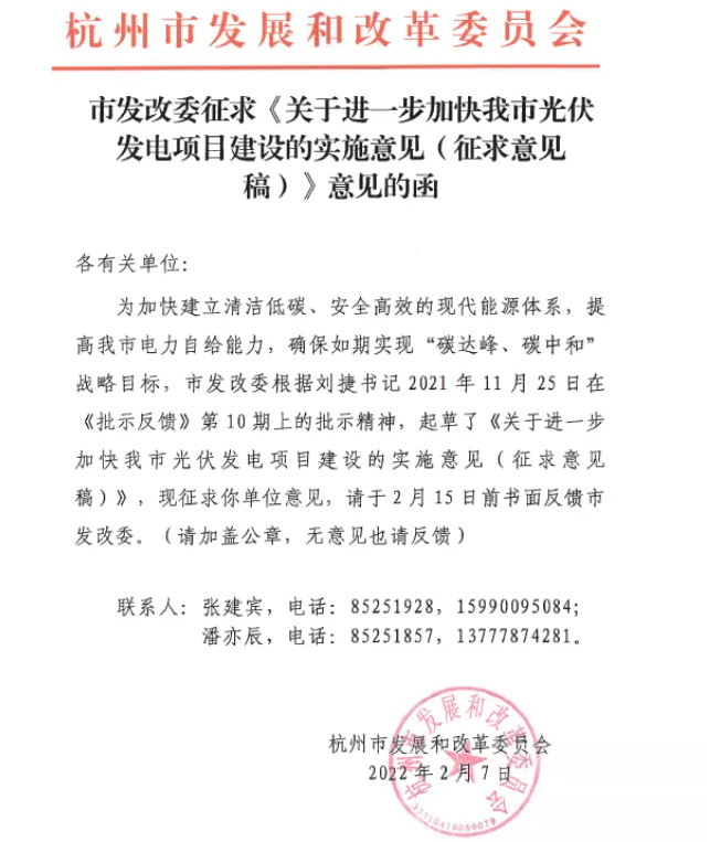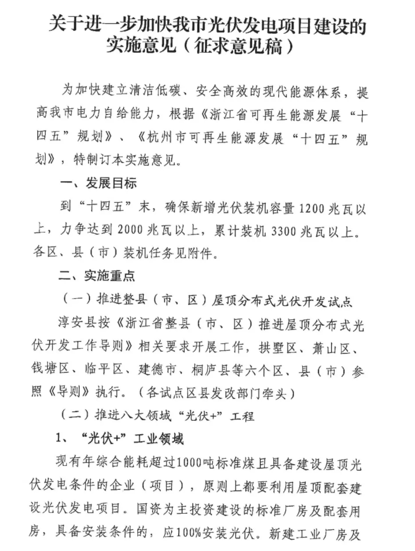 近日,杭州市發(fā)改委發(fā)布了一則關(guān)于征求《關(guān)于進(jìn)一步加快我市光伏發(fā)電建設(shè)的實(shí)施意見(jiàn)(征求意見(jiàn)稿)》意見(jiàn)的函。