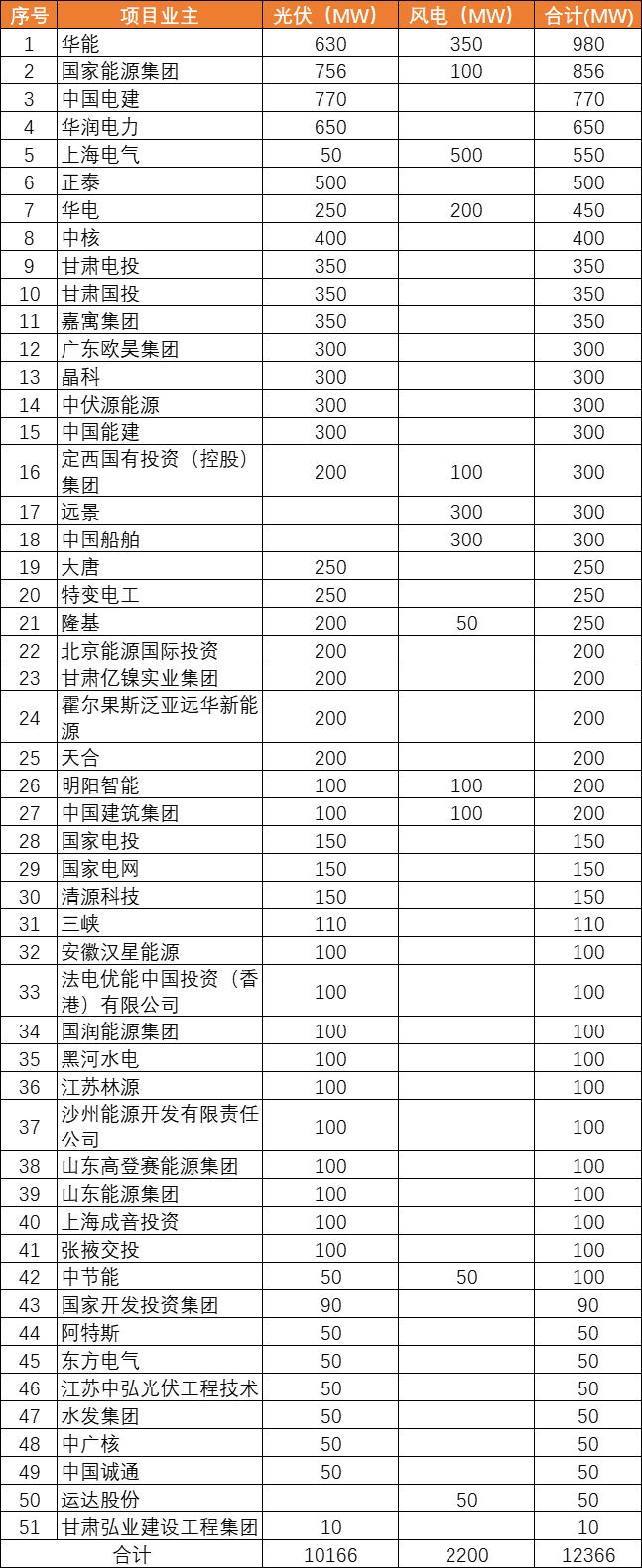 從上表看出,TOP10業(yè)主中分布了央企發(fā)電企業(yè)、央企建設集團、民營光伏頭部企業(yè)以及甘肅當?shù)氐膰衅髽I(yè)等。作為五大發(fā)電集團之一的華能,大力進擊新能源的步調(diào)是可以理解的。“雙碳”目標提出以來,央企率先帶頭,華能集團提出了“十四五”期間全力打造新能源、核電、水電三大支撐,加快提升清潔能源比重,積極實施減煤減碳;并規(guī)劃到2025年,發(fā)電裝機達到3億千瓦左右,新增新能源裝機8000萬千瓦以上,確保清潔能源裝機占比50%以上;到2035年,發(fā)電裝機突破5億千瓦,清潔能源裝機占比75%以上。