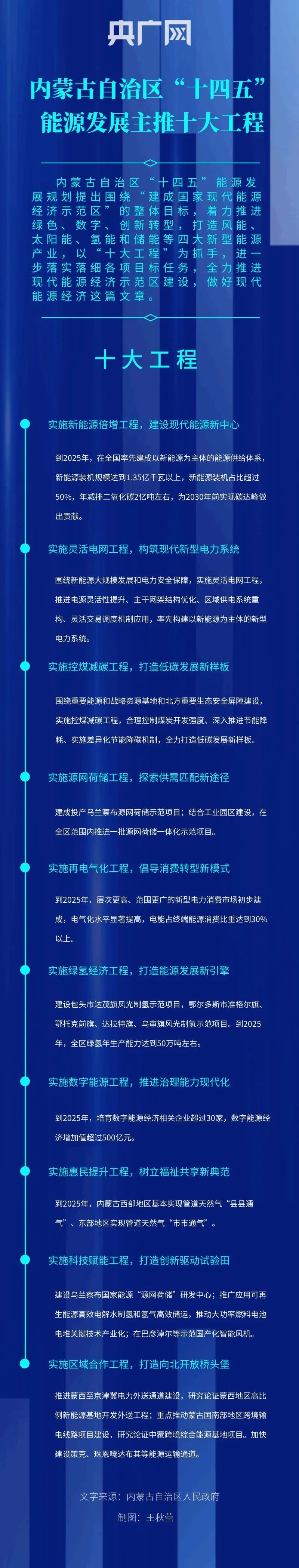 “十四五”時期,內(nèi)蒙古將以建設(shè)國家現(xiàn)代能源經(jīng)濟示范區(qū)為總體目標,推進能源和戰(zhàn)略資源基地優(yōu)化升級。具體工作中,將依托能源基地建設(shè),以資源和市場換產(chǎn)業(yè),開展新型能源產(chǎn)業(yè)關(guān)鍵裝備及其零部件制造,打造風能、太陽能、氫能、儲能四大新型能源產(chǎn)業(yè),以“十大工程”為抓手,進一步落實落細各項目標任務,全力推進現(xiàn)代能源經(jīng)濟示范區(qū)建設(shè),做好現(xiàn)代能源經(jīng)濟這篇文章。