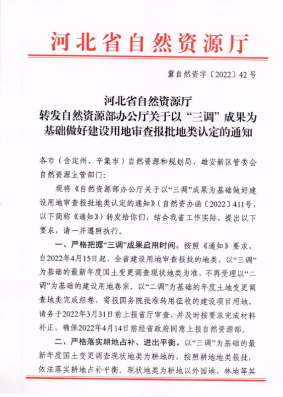 近期,河北省自然資源廳轉(zhuǎn)發(fā)自然資源部辦公廳關(guān)于以“三調(diào)”成果為基礎(chǔ)做好建設(shè)用地審查報批地類認定的通知,按照《通知》要求,自2022年4月15日起,全省建設(shè)用地審查報批的地類,以“三調(diào)”為基礎(chǔ)的最新年度國土變更調(diào)查現(xiàn)狀地類為準(zhǔn),不再受理以“二調(diào)”為基礎(chǔ)的建設(shè)用地卷宗。