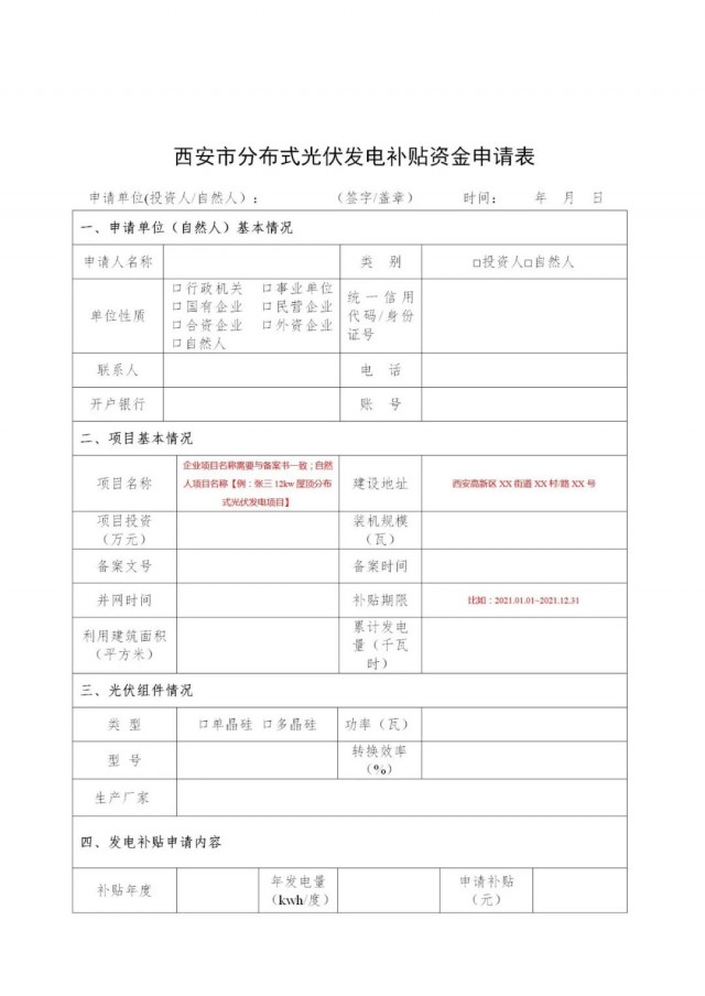 (一)西安市分布式光伏發(fā)電補貼資金申請表(見附件1);