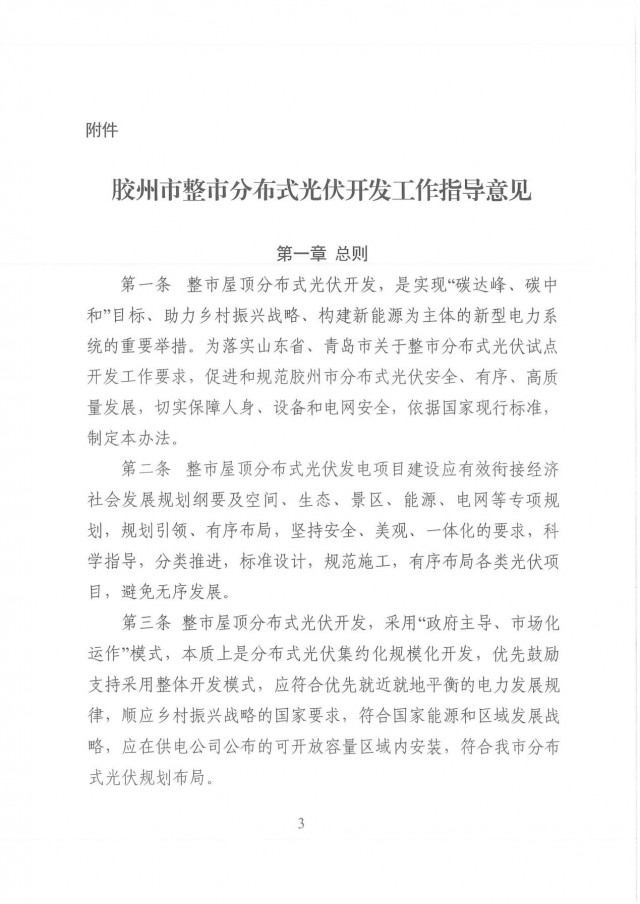 近日,山東膠州市發(fā)改委發(fā)布了《膠州市整市分布式光伏開(kāi)發(fā)工作指導(dǎo)意見(jiàn)》。文件要求,整市分布式光伏開(kāi)發(fā)應(yīng)按照“源網(wǎng)荷儲(chǔ)一體化”理念,明確“集中開(kāi)發(fā)匯集、就地就近消納”為主的實(shí)施路徑。鼓勵(lì)整市分布式光伏開(kāi)發(fā)按照“光伏+儲(chǔ)能”方式推進(jìn),應(yīng)以不出現(xiàn)長(zhǎng)時(shí)間大規(guī)模反送、不增加系統(tǒng)調(diào)峰負(fù)擔(dān)為原則,綜合考慮開(kāi)發(fā)規(guī)模、負(fù)荷特性等因素,按照不低于裝機(jī)容量15%、時(shí)長(zhǎng)不低于2小時(shí)配置或租賃儲(chǔ)能設(shè)施,減少對(duì)其他靈活調(diào)節(jié)類(lèi)電源的依賴(lài)。