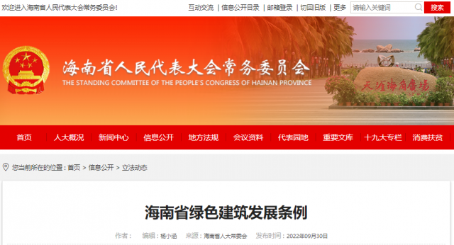 《海南省綠色建筑發(fā)展條例》已由海南省第六屆人民代表大會常務委員會第三十八次會議于2022年9月29日通過,現(xiàn)予公布,自2023年1月1日起施行。
