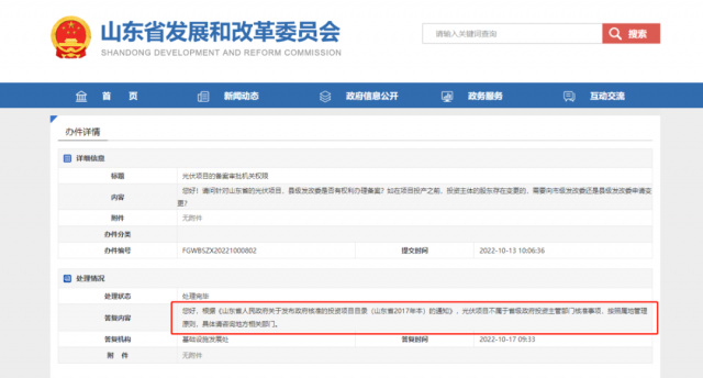 10月17日,山東發(fā)改委針對(duì)光伏項(xiàng)目的備案審批機(jī)關(guān)權(quán)限做出回復(fù),詳情如下: