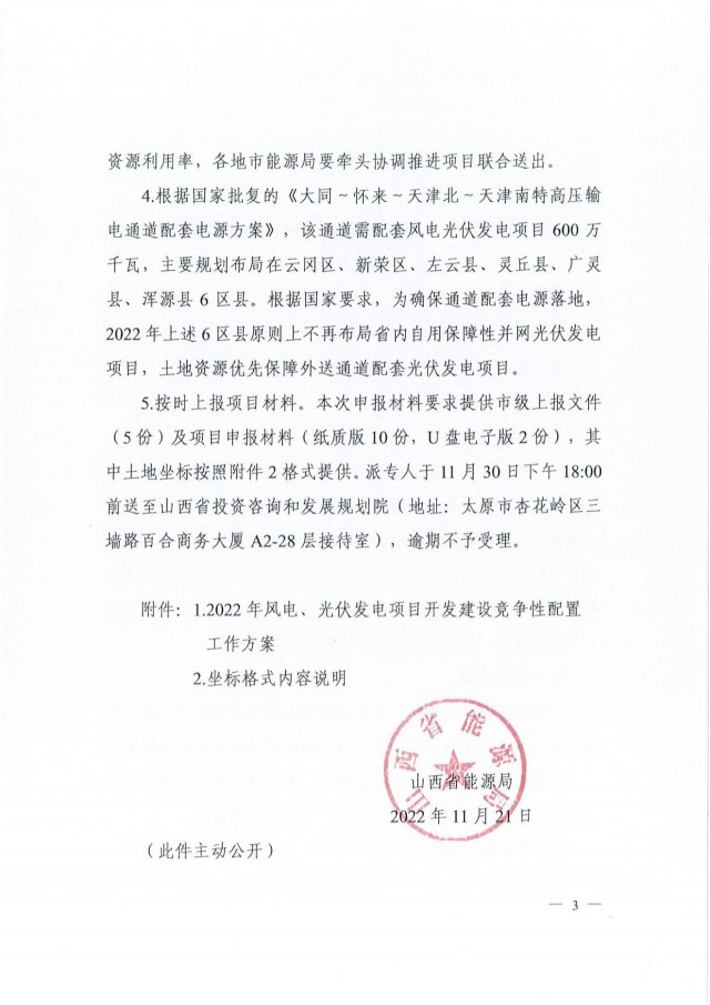 近日,索比光伏網(wǎng)獲悉,山西省能源局印發(fā)《關(guān)于做好2022年風電、光伏發(fā)電開發(fā)建設(shè)競爭性配置有關(guān)事項的通知》(晉能源新能源發(fā)〔2022〕405號),明確安排風電、光伏保障性并網(wǎng)年度規(guī)模1000萬千瓦,獎勵規(guī)模146萬千瓦。