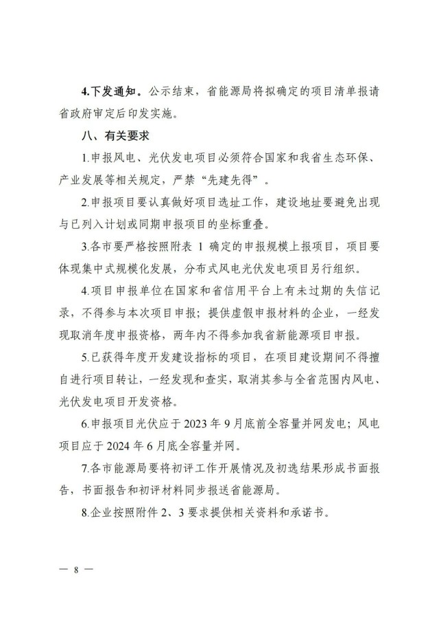 此外,《方案》明確:已獲得年度開發(fā)建設(shè)指標的項目,在項目建設(shè)期間不得擅自進行項目轉(zhuǎn)讓,一經(jīng)發(fā)現(xiàn)和查實,取消其參與全省范圍內(nèi)風電、光伏發(fā)電項目開發(fā)資格。申報項目光伏應(yīng)于2023年9月底前全容量并網(wǎng)發(fā)電;風電項目應(yīng)于2024年6月底全容量并網(wǎng)。