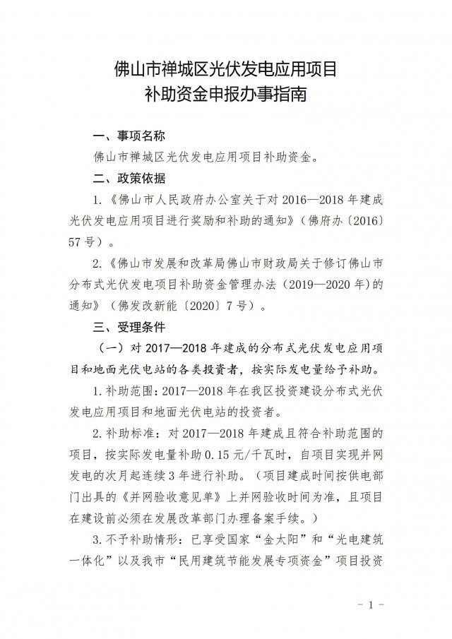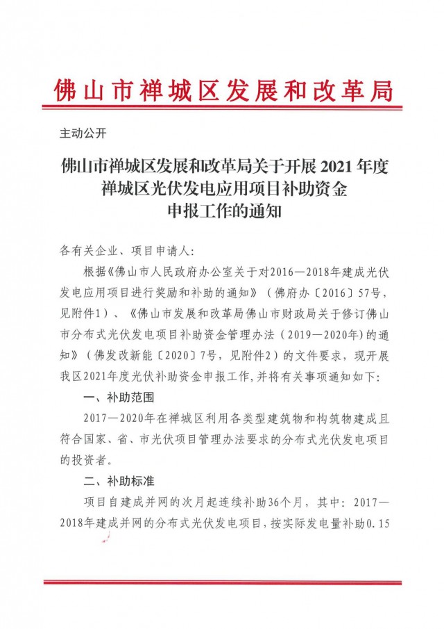 近日,佛山市禪城區(qū)發(fā)展和改革局印發(fā)《關(guān)于開展2021年度禪城區(qū)光伏發(fā)電應(yīng)用項(xiàng)日補(bǔ)助資金申報(bào)工作的通知》。