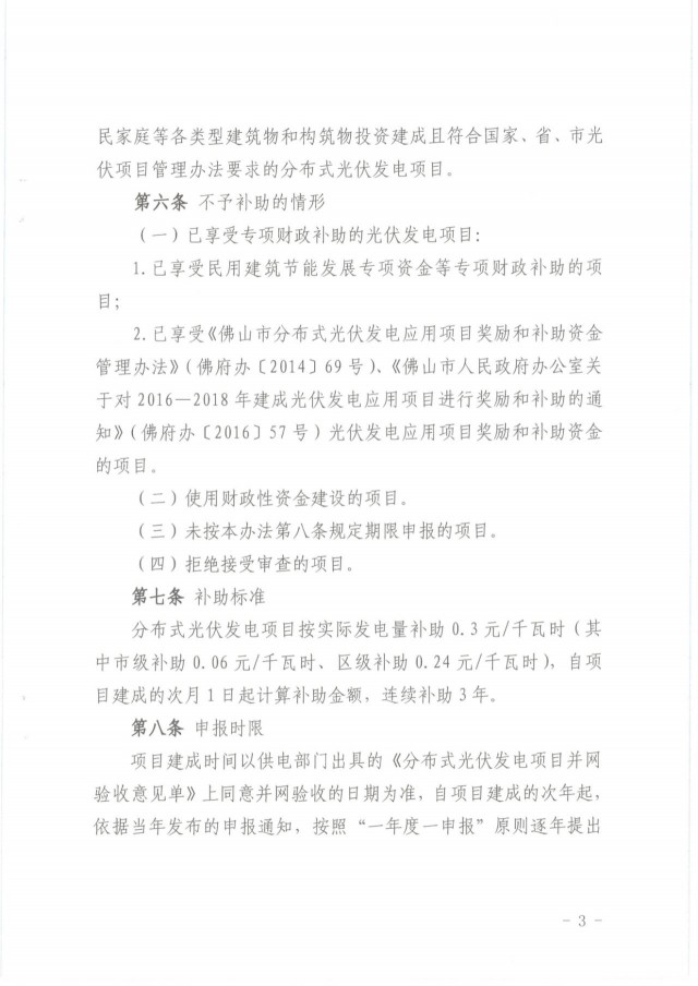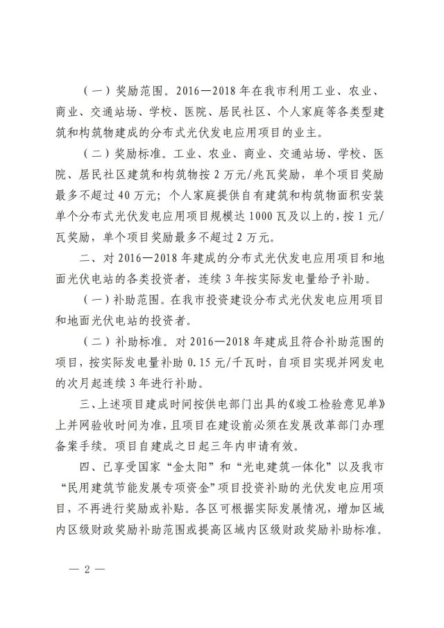 項(xiàng)目自建成并網(wǎng)的次月起連續(xù)補(bǔ)助36個(gè)月,其中:2017一2018年建成并網(wǎng)的分布式光伏發(fā)電項(xiàng)目,按實(shí)際發(fā)電量補(bǔ)助0.15元/千瓦時(shí);2019-2020年建成并網(wǎng)的分布式光伏發(fā)電項(xiàng)目,按實(shí)際發(fā)電量補(bǔ)助0.3元/千瓦時(shí)。