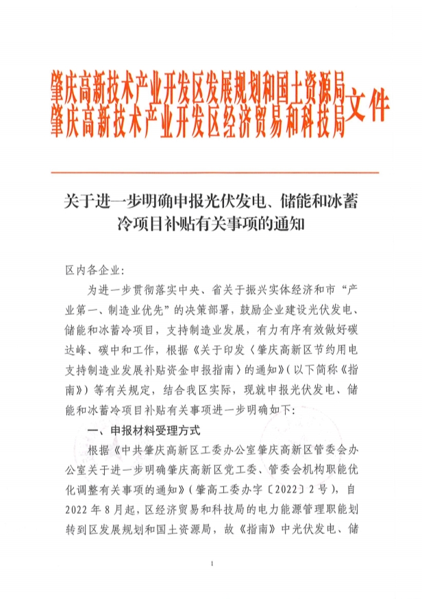 為進(jìn)一步貫徹落實(shí)中央、省關(guān)于振興實(shí)體經(jīng)濟(jì)和市“產(chǎn)業(yè)第一、制造業(yè)優(yōu)先”的決策部署,鼓勵(lì)企業(yè)建設(shè)光伏發(fā)電、儲(chǔ)能和冰蓄冷項(xiàng)目,支持制造業(yè)發(fā)展,有力有序有效做好碳達(dá)峰、碳中和工作,根據(jù)《關(guān)于印發(fā)〈肇慶高新區(qū)節(jié)約用電支持制造業(yè)發(fā)展補(bǔ)貼資金申報(bào)指南〉的通知》(以下簡(jiǎn)稱《指南》)等有關(guān)規(guī)定,結(jié)合我區(qū)實(shí)際,現(xiàn)就申報(bào)光伏發(fā)電、儲(chǔ)能和冰蓄冷項(xiàng)目補(bǔ)貼有關(guān)事項(xiàng)進(jìn)一步明確如下: