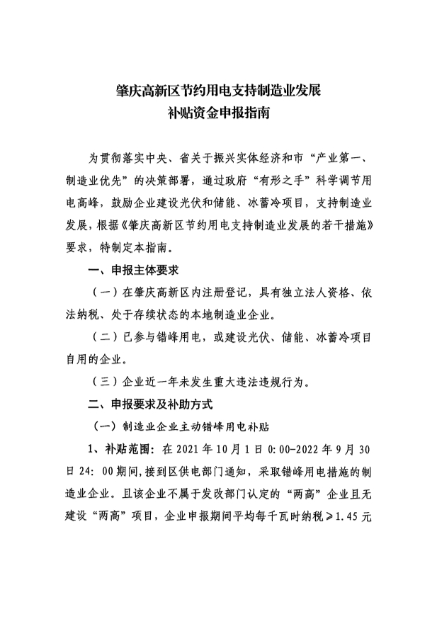 附件:關(guān)于印發(fā)《肇慶高新區(qū)節(jié)約用電支持制造業(yè)發(fā)展補(bǔ)貼資金申報(bào)指南》的通知