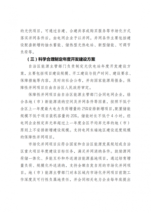 積極參與全國(guó)統(tǒng)一電力市場(chǎng)建設(shè),穩(wěn)妥推進(jìn)光伏等新能源參與電力市場(chǎng)交易,適應(yīng)新型電力系統(tǒng)發(fā)展要求。能源監(jiān)管機(jī)構(gòu)核定全區(qū)光伏發(fā)電項(xiàng)目年度保障收購(gòu)小時(shí)數(shù),保障收購(gòu)小時(shí)數(shù)以內(nèi)的電量由電網(wǎng)企業(yè)通過(guò)購(gòu)售電合同結(jié)算,對(duì)增配儲(chǔ)能的項(xiàng)目適當(dāng)予以傾斜,鼓勵(lì)保障收購(gòu)小時(shí)數(shù)以外的電量通過(guò)市場(chǎng)交易消納。