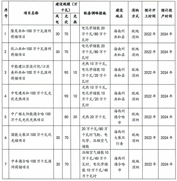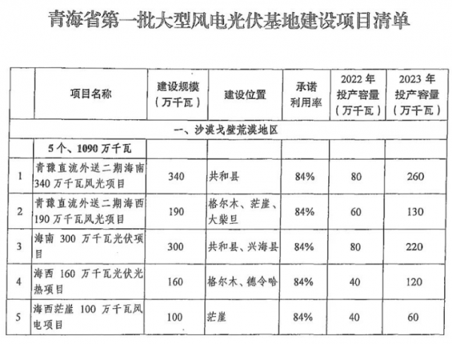 2022年8月24日,青海省能源局在“關于加強海南州清潔能源產(chǎn)業(yè)建設的建議”——省十三屆人民代表大會第七次會議第224014號建議答復的函上表示,省第二批大型風電光伏基地取得重大進展,7個項目、合計700萬千瓦納入第二批以沙漠、戈壁、荒漠地區(qū)為重點的大型風電光伏基地建設項目清單,其中隆發(fā)共和100萬千瓦源網(wǎng)荷儲項目、中能建江蘇設計院/江蘇美科共和100萬千瓦源網(wǎng)荷儲項目、伏山共和100萬千瓦源網(wǎng)荷儲項目、中電建共和100萬千瓦光伏光熱項目共400萬落地海南州共和縣。