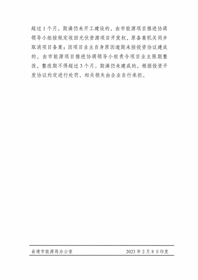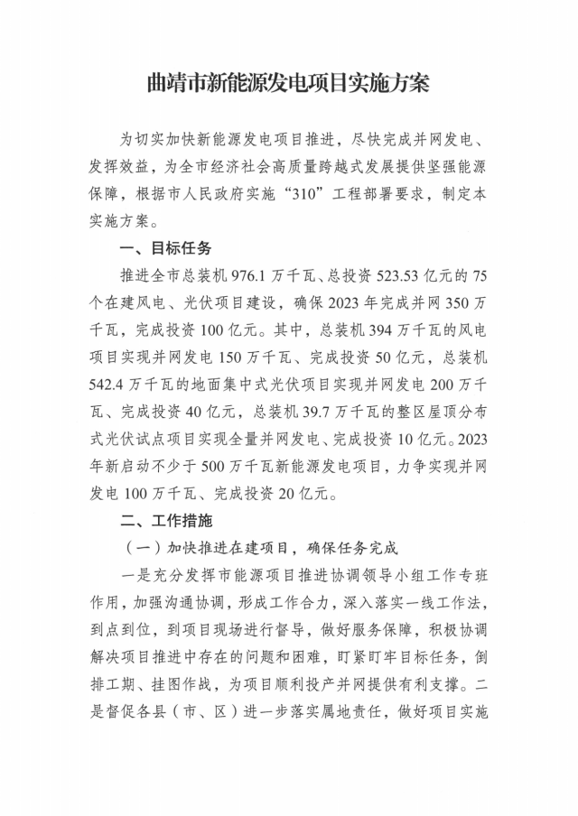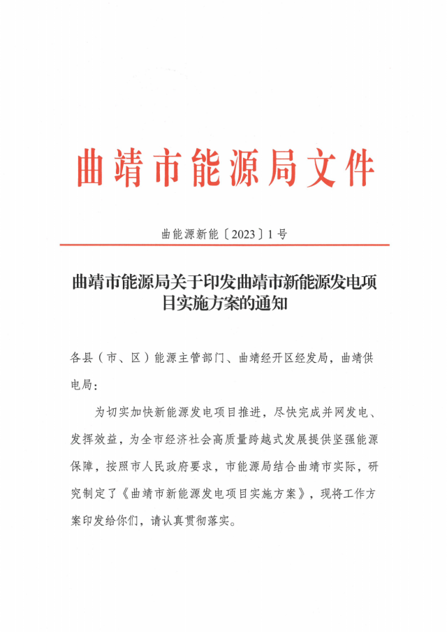 2月8日,曲靖市能源局關(guān)于印發(fā)曲靖市新能源發(fā)電項目實施方案的通知。通知顯示,為切實加快新能源發(fā)電項目推進,盡快完成并網(wǎng)發(fā)電、發(fā)揮效益,曲靖市全力推進全市總裝機976.1萬千瓦、總投資523.53億元的75個在建風(fēng)電、光伏項目建設(shè),確保2023年完成并網(wǎng)350萬千瓦,完成投資100億元。