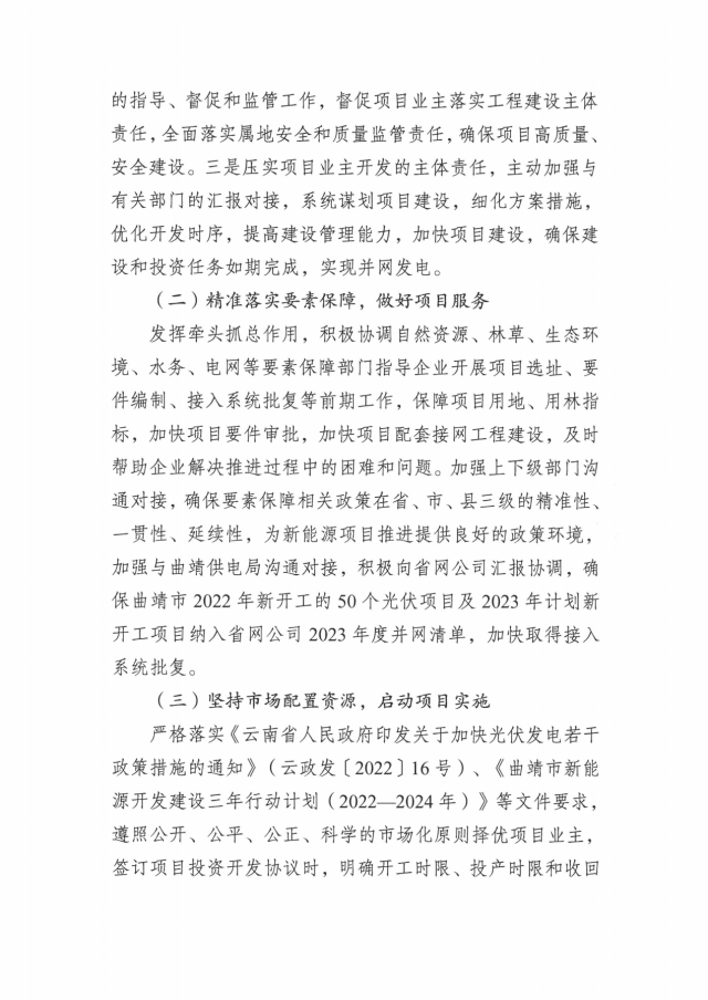 同時,確保曲靖市2022年新開工的50個光伏項目及2023年計劃新開工項目納入省網(wǎng)公司2023年度并網(wǎng)清單,加快取得接入系統(tǒng)批復(fù)。