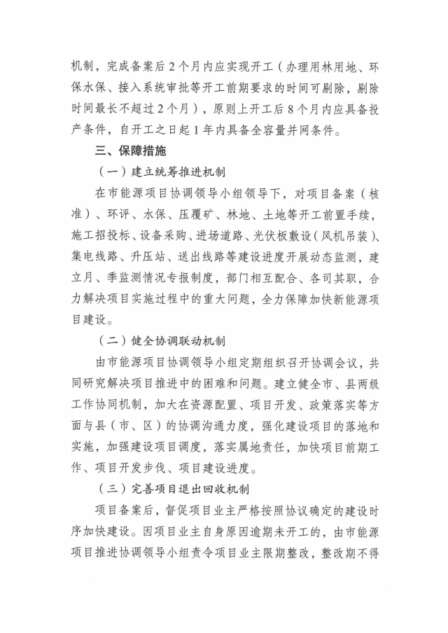 按照相關(guān)文件要求,科學(xué)的市場化原則擇優(yōu)項目業(yè)主,簽訂項目投資開發(fā)協(xié)議時,明確開工時限、投產(chǎn)時限和收回機制,完成備案后2個月內(nèi)應(yīng)實現(xiàn)開工(辦理用林用地、環(huán) 保水保、接入系統(tǒng)審批等開工前期要求的時間可剔除,剔除 時間最長不超過2個月),原則上開工后8個月內(nèi)應(yīng)具備投產(chǎn)條件,自開工之日起1年內(nèi)具備全容量并網(wǎng)條件。