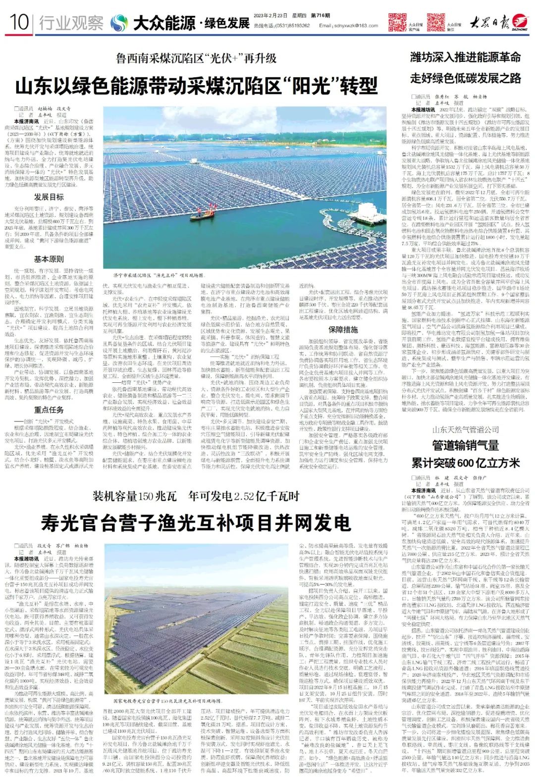 近日,山東印發(fā)《魯西南采煤沉陷區(qū)“光伏+”基地規(guī)劃建設方案(2023—2030年)》(以下簡稱《方案》),《方案》圍繞加快規(guī)劃建設新型能源體系,統(tǒng)籌光伏開發(fā)與采煤塌陷地治理,統(tǒng)籌項目建設與產業(yè)融合,統(tǒng)籌就地就近消納與電力外送,全力打造集光伏電站建設、生態(tài)綜合治理、產業(yè)融合發(fā)展、多元消納保障為一體的“光伏+”特色發(fā)展基地,加快資源型地區(qū)能源轉型再升級,助力綠色低碳高質量發(fā)展先行區(qū)建設。
