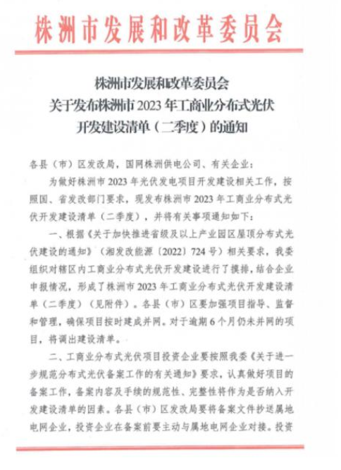 4月18日,株洲市發(fā)改委發(fā)布關于《株洲市2023年工商業(yè)分布式光伏開發(fā)建設清單(二季度)》的通知。株洲市發(fā)改委組織對轄區(qū)內工商業(yè)分布式光伏開發(fā)建設進行了摸排,結合企業(yè)申報情況,形成了株洲市2023年工商業(yè)分布式光伏開發(fā)建設清單(二季度)(見附件)。各縣(市)區(qū)要加強項目指導、監(jiān)督和管理,確保項目按時建成并網。對于逾期6個月仍未并網的項目,將調出建設清單。