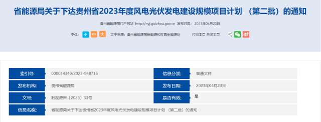 4月23日,貴州省能源局下達(dá)2023年度風(fēng)電光伏發(fā)電建設(shè)規(guī)模項(xiàng)目計(jì)劃(第二批),總裝機(jī)為1258萬(wàn)千瓦,其中風(fēng)電930萬(wàn)千瓦,光伏發(fā)電328萬(wàn)千瓦,擬全部接入貴州電網(wǎng)。