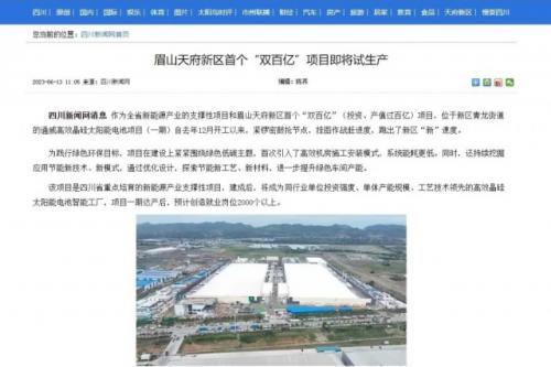 報(bào)道指出,作為全省新能源產(chǎn)業(yè)的支撐性項(xiàng)目和眉山天府新區(qū)首個(gè)“雙百億”(投資、產(chǎn)值過(guò)百億)項(xiàng)目,位于新區(qū)青龍街道的通威高效晶硅太陽(yáng)能電池項(xiàng)目(一期)自去年12月開(kāi)工以來(lái),緊鑼密鼓搶節(jié)點(diǎn),掛圖作戰(zhàn)趕進(jìn)度,跑出了新區(qū)“新”速度。該項(xiàng)目是四川省重點(diǎn)培育的新能源產(chǎn)業(yè)支撐性項(xiàng)目,建成后,將成為同行業(yè)工藝技術(shù)領(lǐng)先的高效晶硅太陽(yáng)能電池智能工廠(chǎng),項(xiàng)目一期達(dá)產(chǎn)后,預(yù)計(jì)創(chuàng)造就業(yè)崗位2000個(gè)以上。